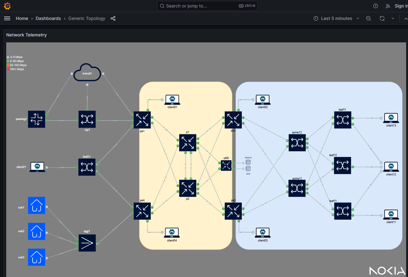 gNMIc is a telemetry collection client, developed by Nokia and donated to the Openconfig project. It allows operators to subscribe to streaming telemetry data from network devices and export it to a variety of destinations. In this lab, gNMIc is used to subscribe to the telemetry data from SR Linux and SR OS nodes and export it to the prometheus time-series database.