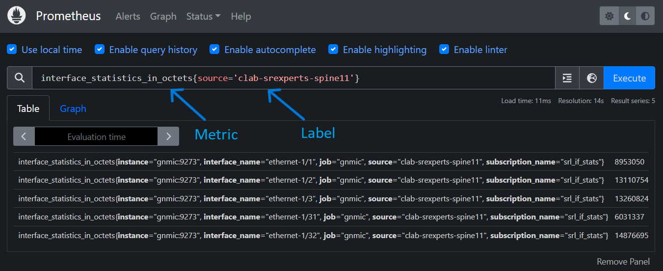 Prometheus is a widely used open-source time-series database (TSDB). In this activity, it is utilized to store telemetry data exported by gNMIc. The Prometheus configuration file prometheus.yml contains a minimal setup and directs Prometheus to scrape data from the gNMIc collector at 5-second intervals. Metrics are stored as time-series data, including timestamps indicating when they were recorded, along with optional key-value pairs known as labels.